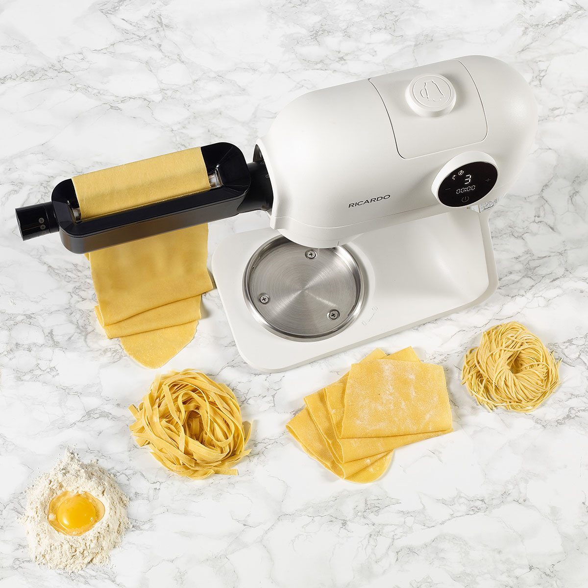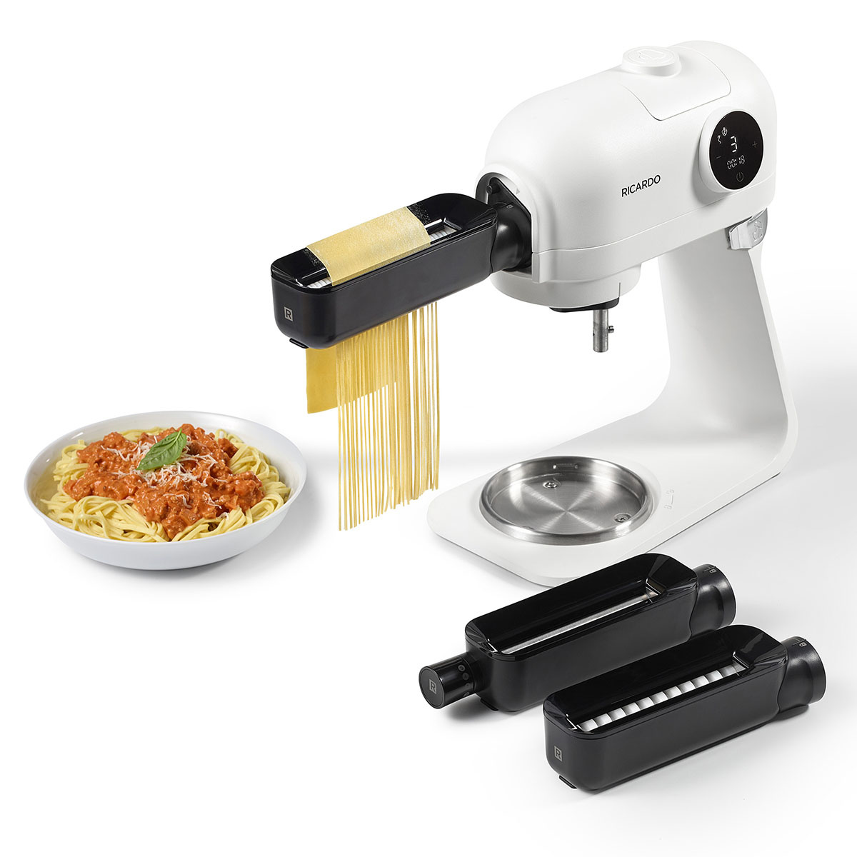 Préparez des pâtes fraîches facilement et rapidement avec cet ensemble de laminoir et coupe-pâtes pour le batteur sur socle RICARDO. Il comprend trois accessoires: un laminoir avec cinq réglages d’épaisseur pour créer des feuilles de pâte pour fettuccine et linguine. Idéal pour réaliser des lasagnes, des cannellonis ou des pâtes coupées à la main.